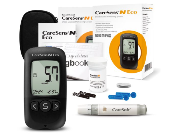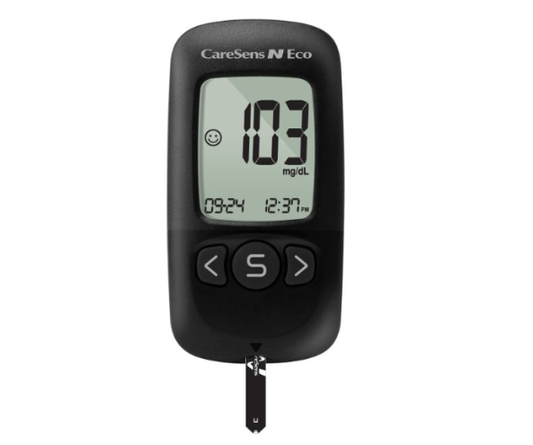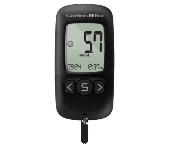 CareSens N Eco Blood Glucose Monitoring System is used for the quantitative measurement of the glucose level in capillary whole blood as an aid in monitoring diabetes management effectively at home or in clinical settings.