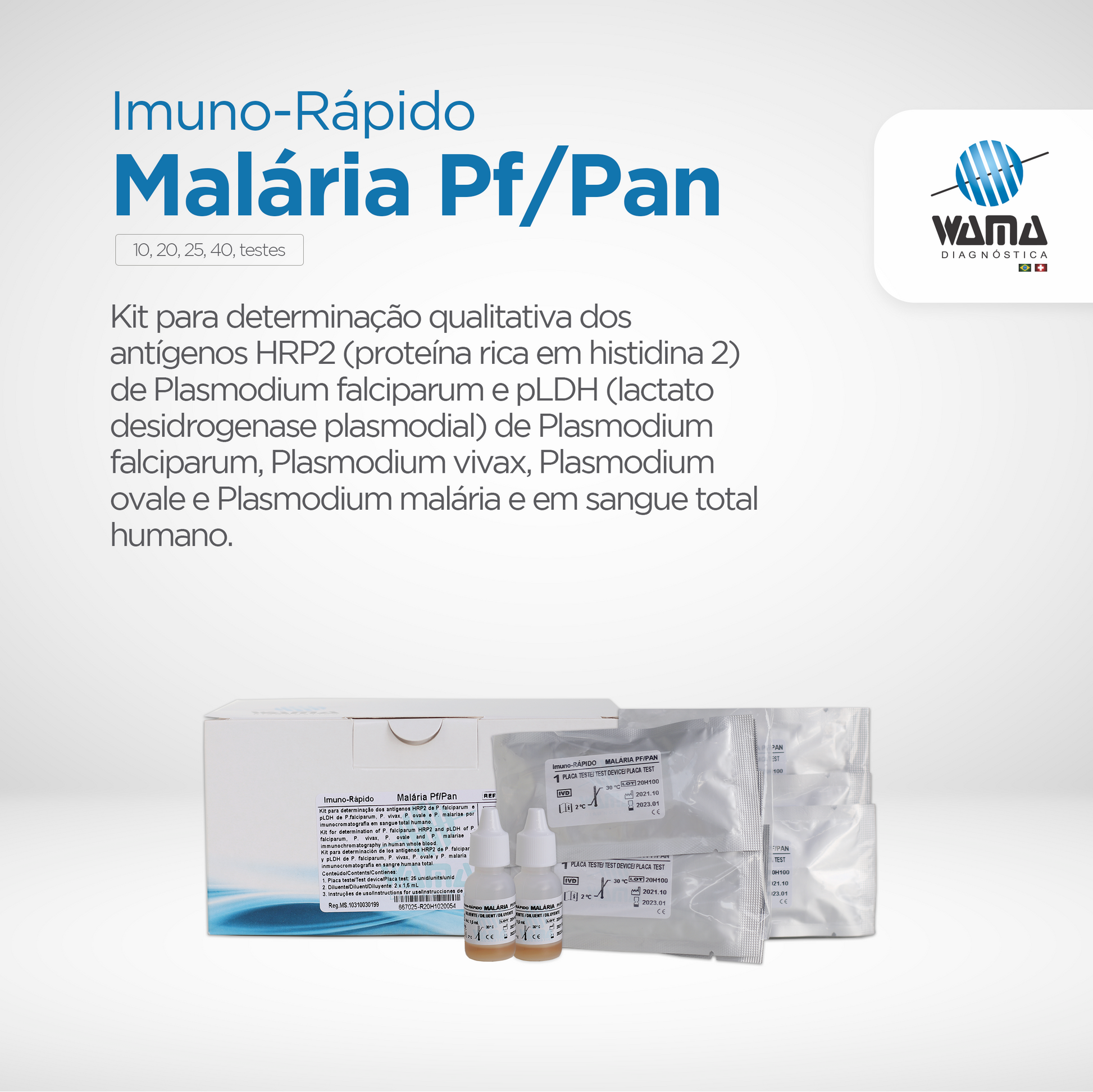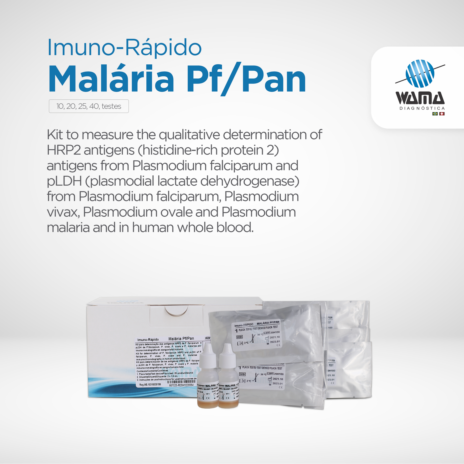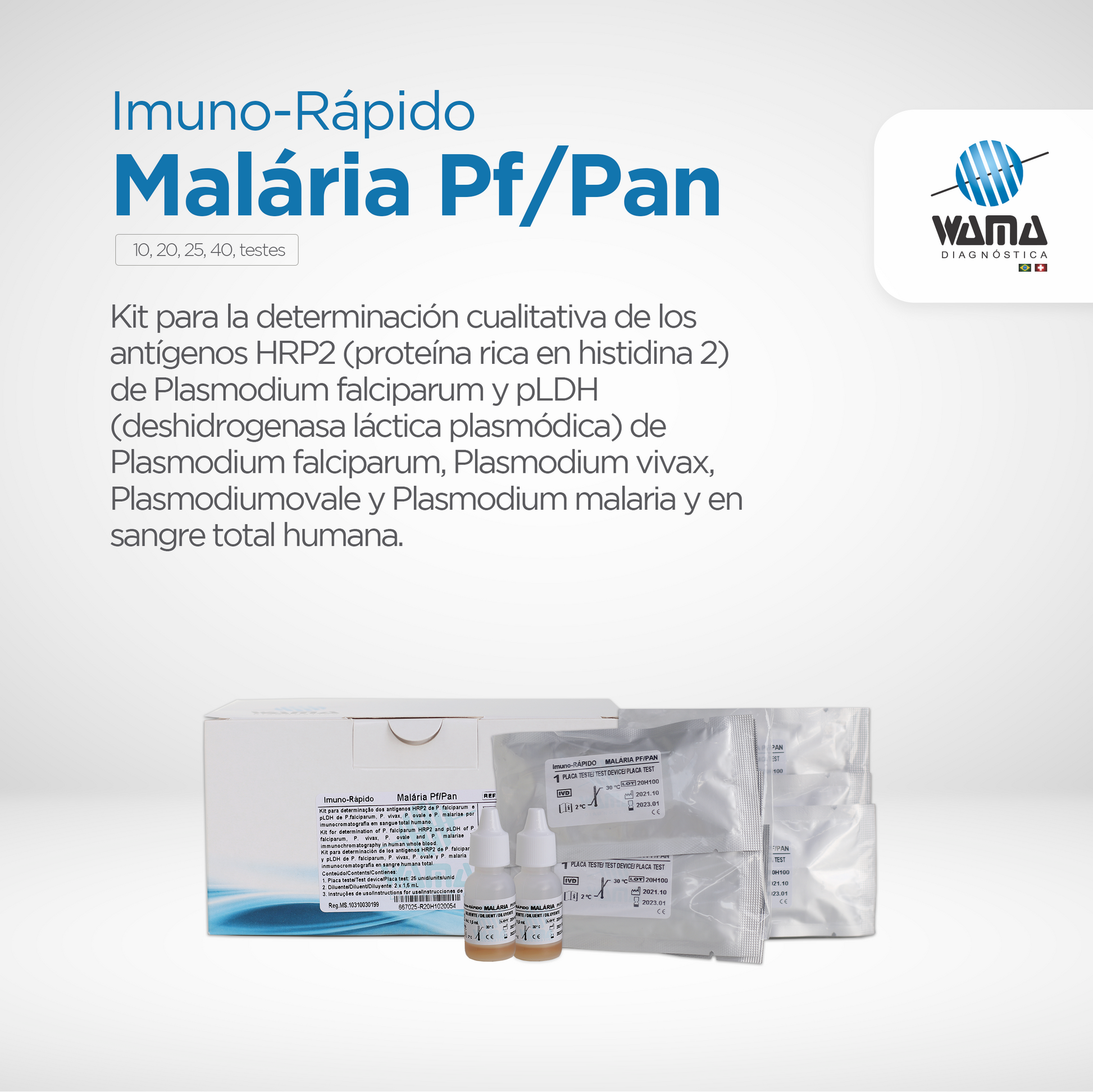 The Imuno-Rápido Malaria Pf / Pan Ag from WAMA is an immunochromatographic test for the qualitative determination of the presence of Plasmodium falciparum HRP2 antigens and pLDH of P. falciparum, P. vivax, P. malariae and P. ovale in whole blood samples human. Professional use only (trained laboratory professionals, healthcare workers etc.)